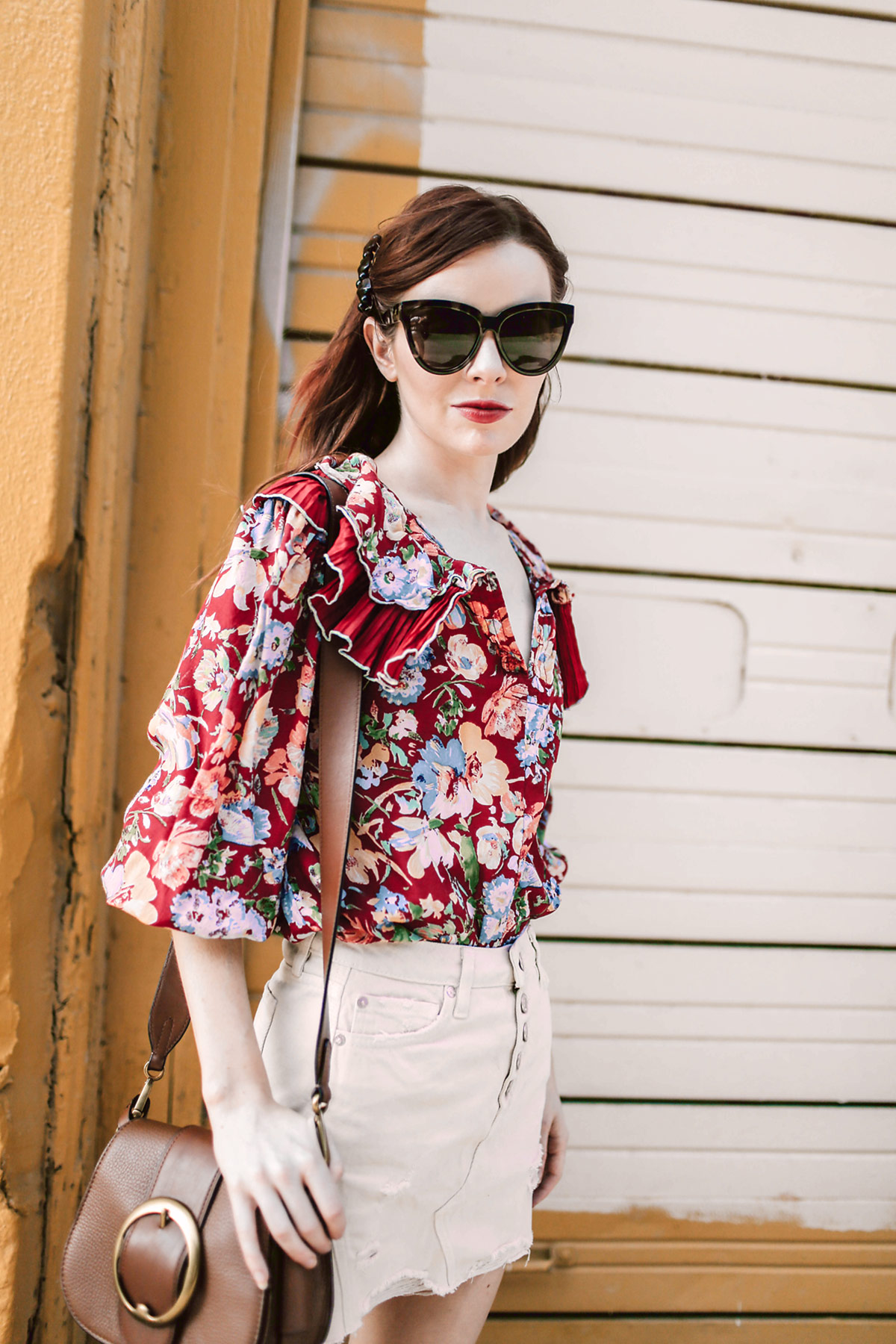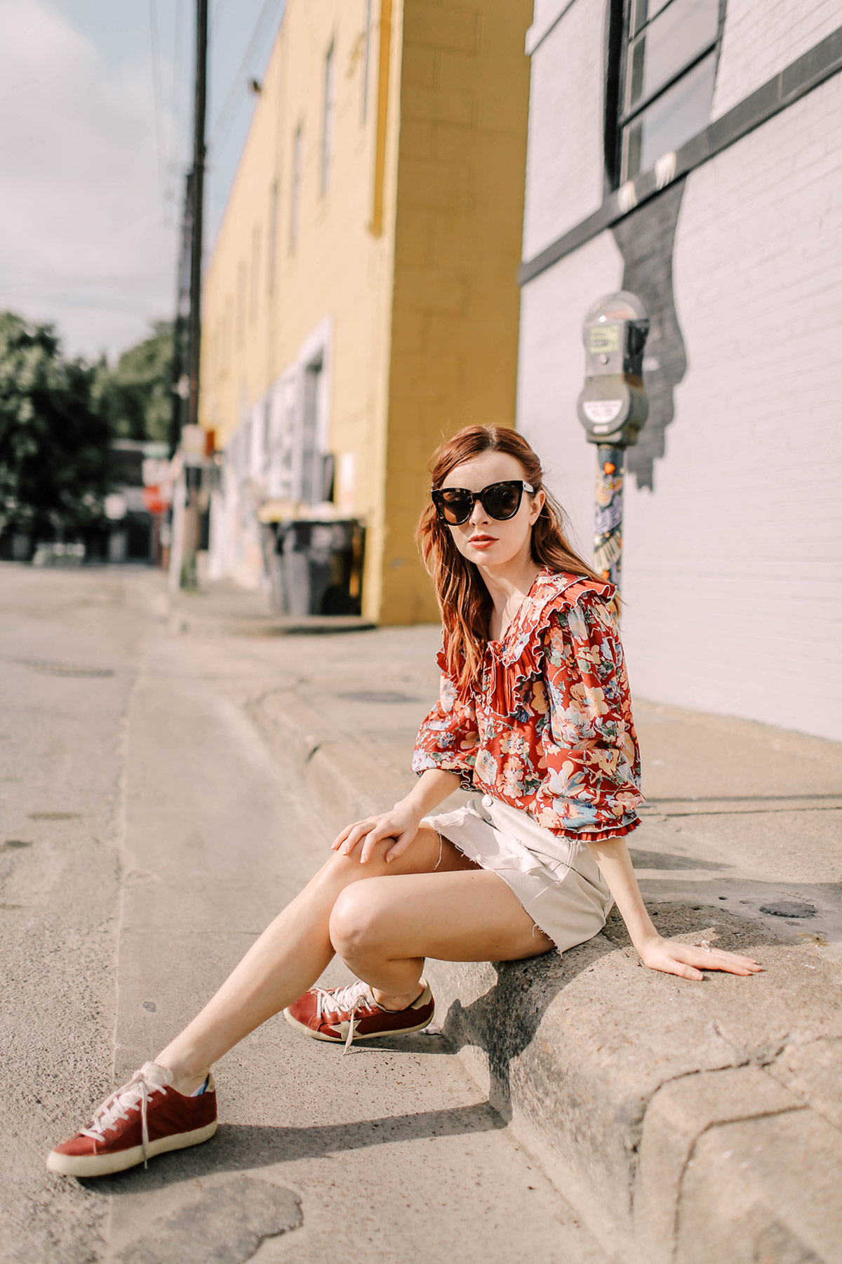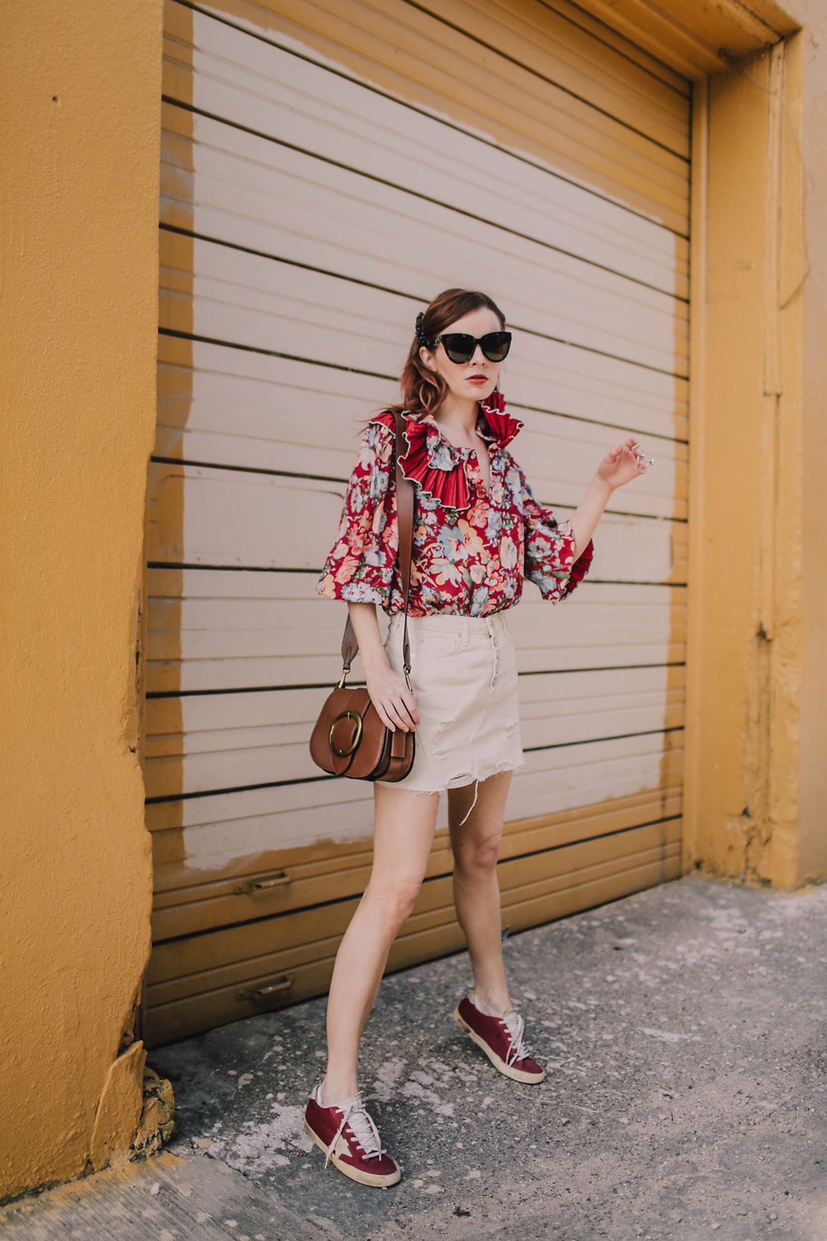 I’ve been craving a white denim miniskirt for easy summer outfits and I finally got this one at Free People. When it’s scorching hot outside and you’ve got a bit of tan going on, nothing could be more appropriate and simple to style. With a band tee and a fun pair of pumps for a concert, or with leather sandals and a tank top for a weekend off. I wore mine with this vintage Jeanne Marc blouse and a big 70s barrette. Worn with Le Specs sunglasses, Golden Goose sneakers, and a Polo Ralph Lauren bag.